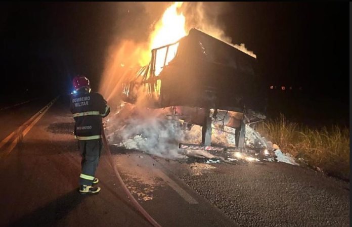 Uma carreta carregada com farinha de trigo pegou fogo na noite de sábado (14 de março de 2026) na BR-070, a cerca de 20 km do município de Campo Verde (139 km de Cuiabá). O incidente mobilizou o Corpo de Bombeiros Militar de Mato Grosso (CBMMT) e a Polícia Rodoviária Federal (PRF), que controlaram o trânsito durante a ocorrência.