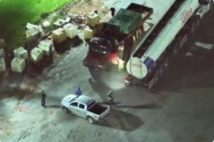 Um vídeo divulgado pela Polícia Civil registra o instante em que dois funcionários de um posto de combustíveis foram presos em flagrante, acusados de desviar mais de 6 mil litros de diesel para abastecer um garimpo ilegal no município de Pontes e Lacerda, a aproximadamente 483 km de Cuiabá.Durante a operação, os agentes também apreenderam cerca de 500 litros de etanol, totalizando 6,5 mil litros de combustível ilícito, além de dois caminhões utilizados no esquema.As investigações começaram após a polícia receber diversas denúncias sobre a suspeita de desvio sistemático de combustível no estabelecimento. Ao chegar ao local, os policiais flagraram o momento final do esquema: o abastecimento de seis contêineres de mil litros cada, instalados sobre uma carreta, por meio de uma motobomba.